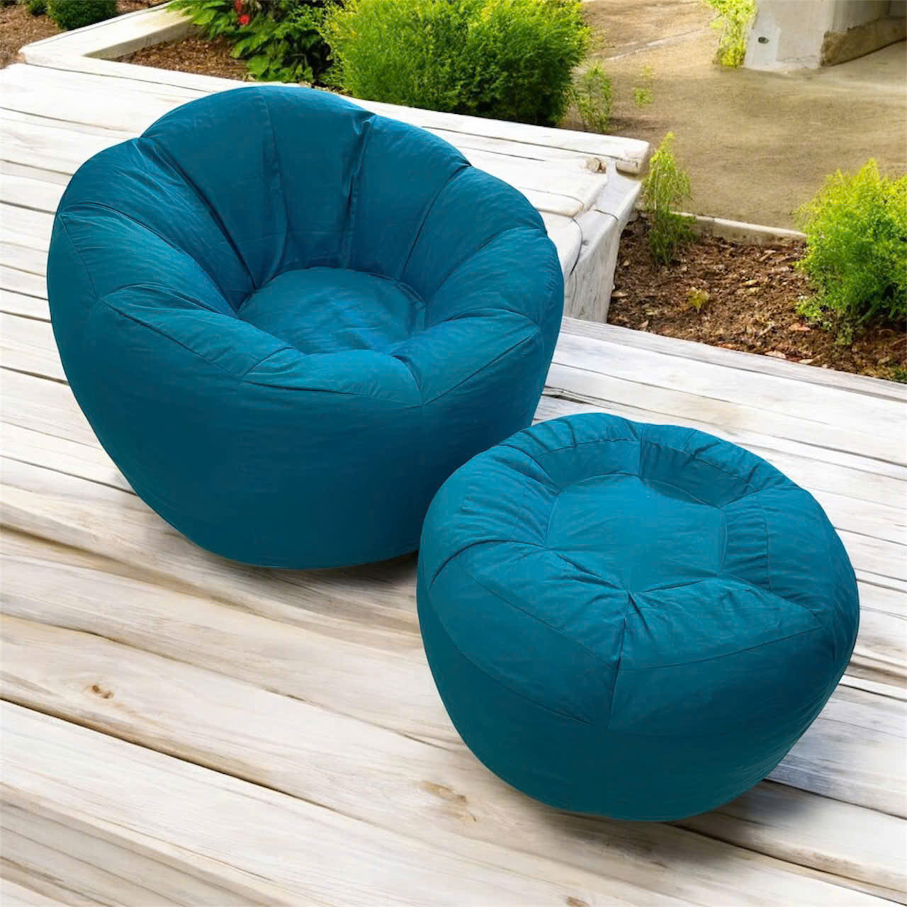 Bộ ghế lười Hoa Cúc xanh đặt ngoài ban công sàn gỗ
